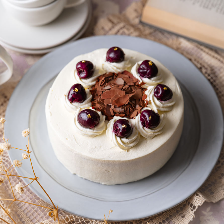 中央にチョコレートコポーをのせて、クリームの上にチェリー、金箔をのせて完成。