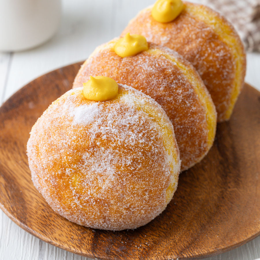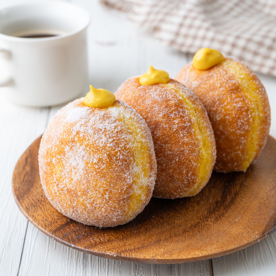 できあがったクリームを準備した絞り袋に入れ、ドーナツにあけた穴から50gずつ詰め、完成。