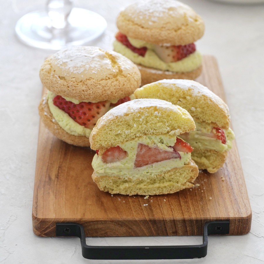 苺の甘酸っぱさとピスタチオのナッティーなコクがおいしいブッセです。