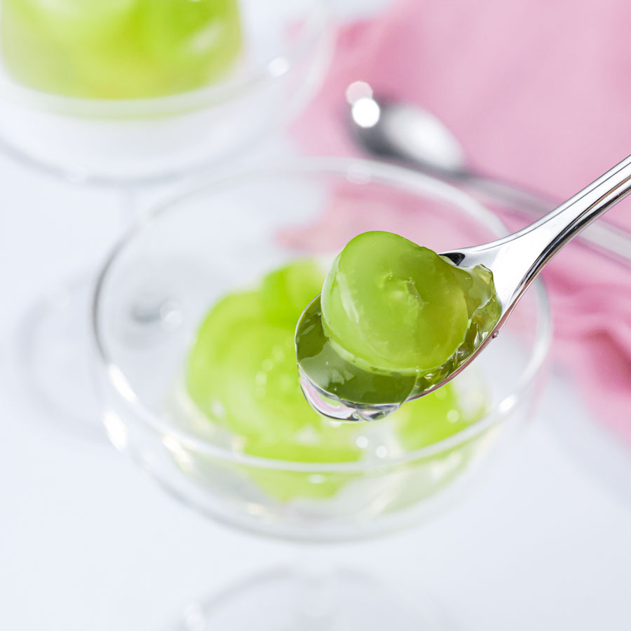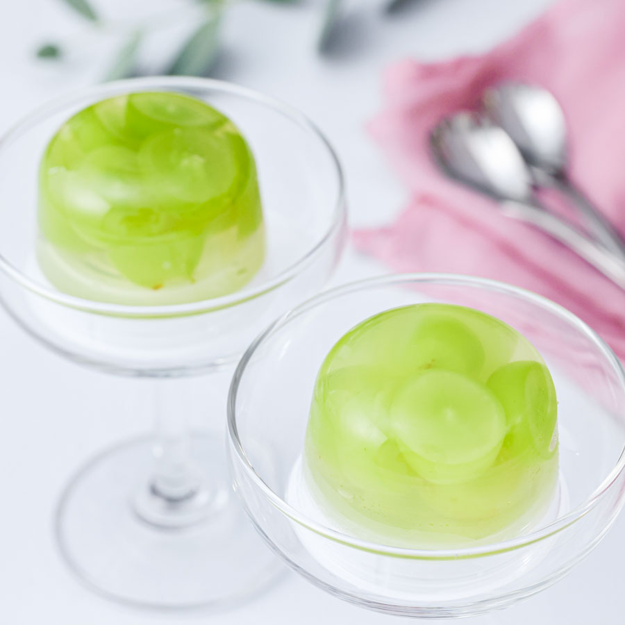 白ワインがふわりと香るのど越しが良いゼリーにシャインマスカットをたっぷり入れて作ります。