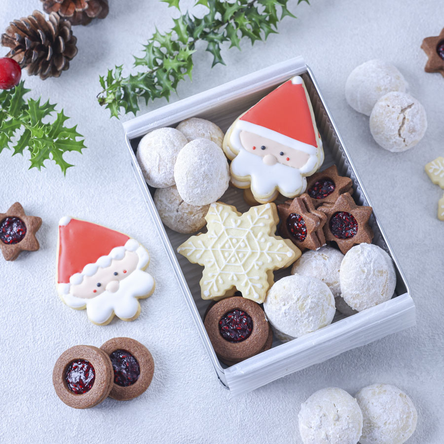 花型とハート型を組み合わせで抜いたクッキーを焼きあげて、赤/白/肌色/黒のアイシングで色づけするとクリスマスにピッタリなサンタさんのお顔を作れます。