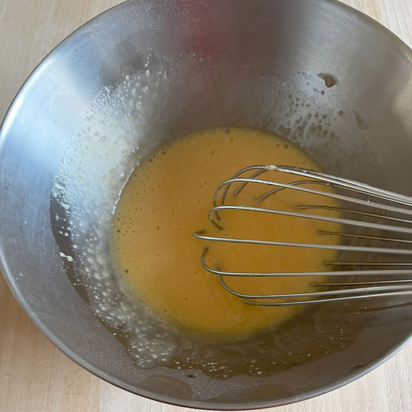 卵に砂糖を加え白っぽくもったりするまで泡立てる。