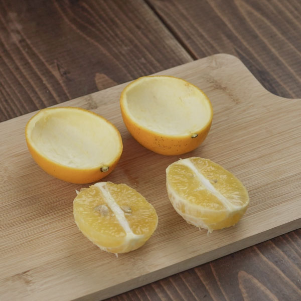 中身を絞ってレモン汁を出す。