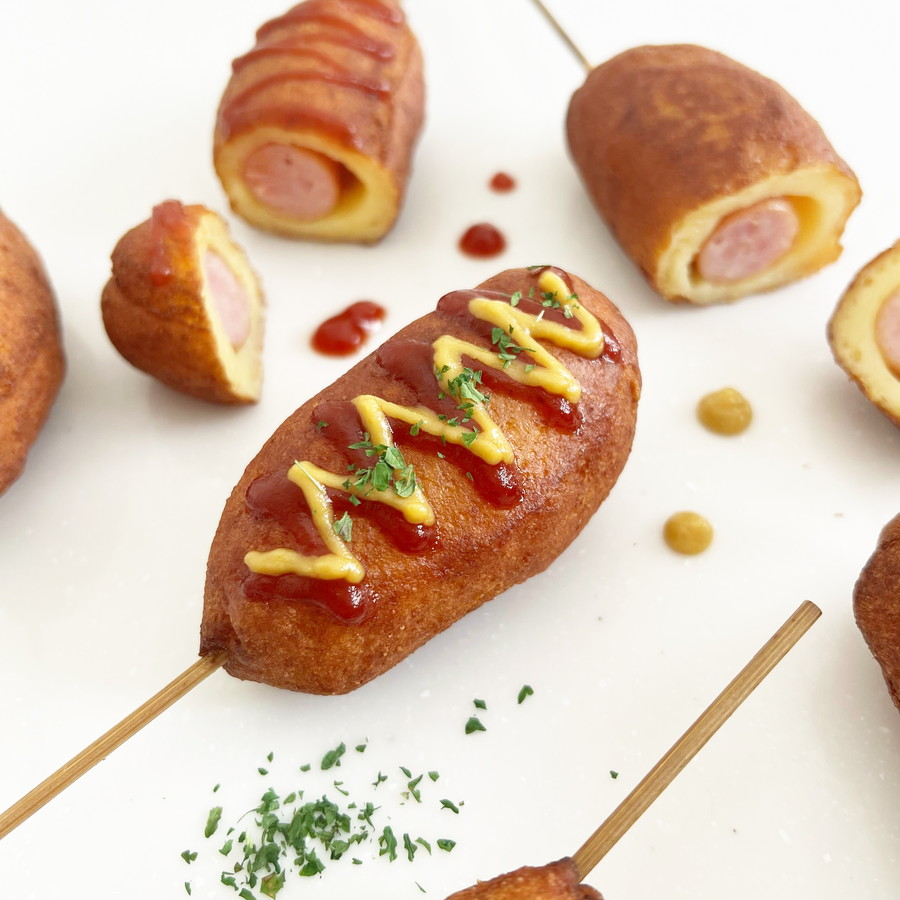 アメリカンドックが冷めたら、竹串が入口側になるよう透明袋に1本ずつ入れ、余った部分を後ろに折ります。