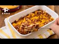 16を3回繰り返し、最後にベシャメルソース、ビーフのラグー、チェダーチーズを重ね、エダムチーズを散らす。