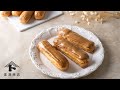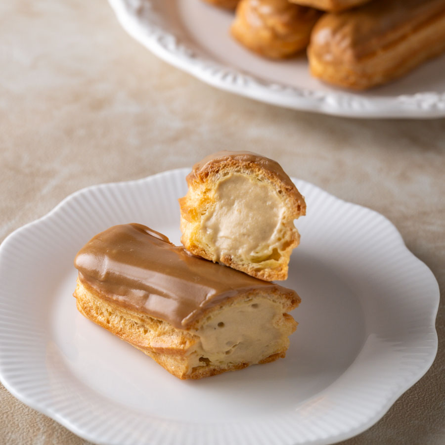 このレシピはカスタードクリームと生クリームを合わせたデュプロマットクリームにコーヒーを加え、フォンダンカフェをコーティングしたちょっと大人なエクレアです。