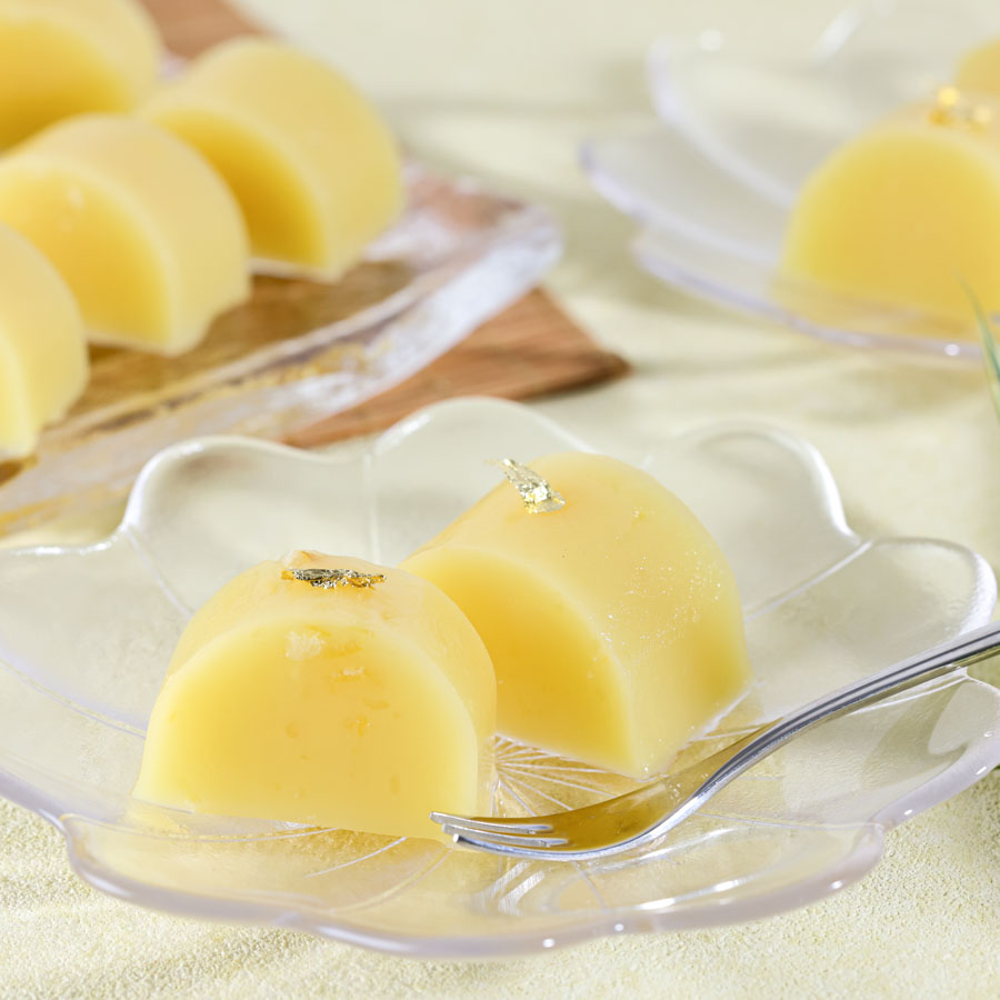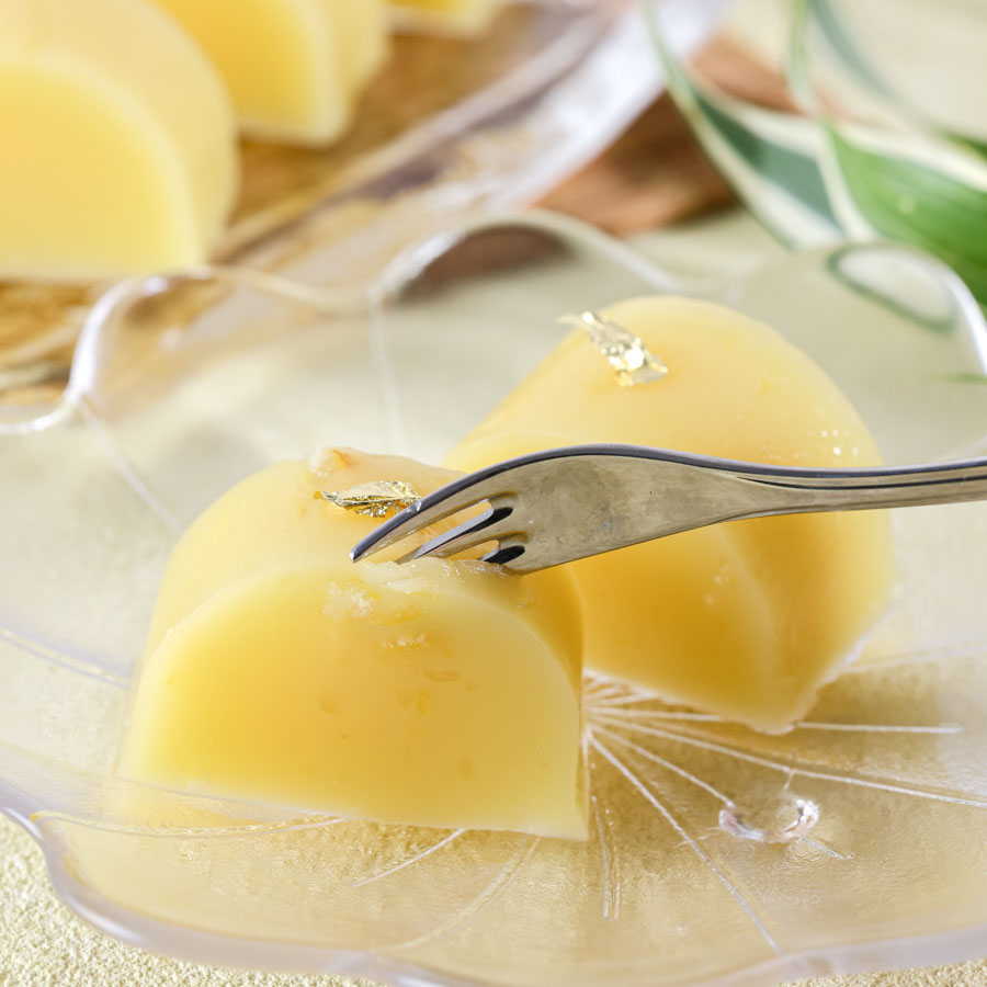 型から外し、お好みの大きさにカットしし、金箔を飾って完成。