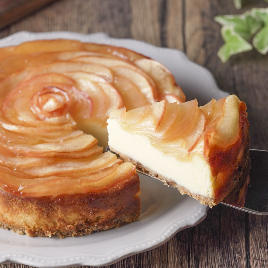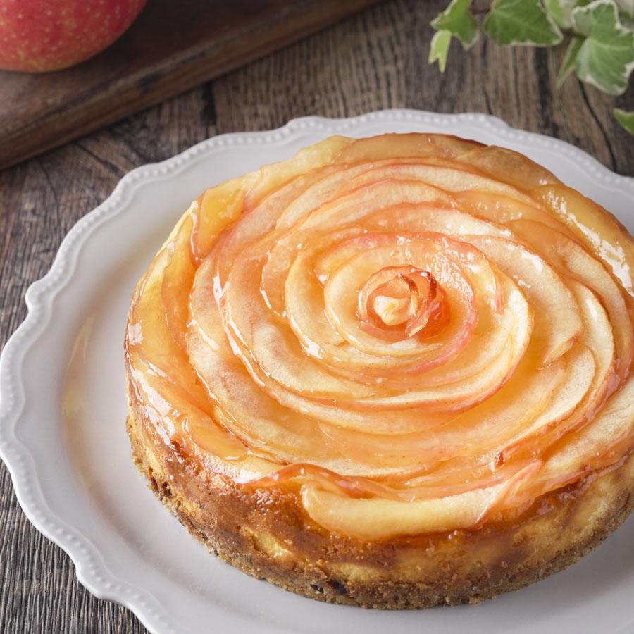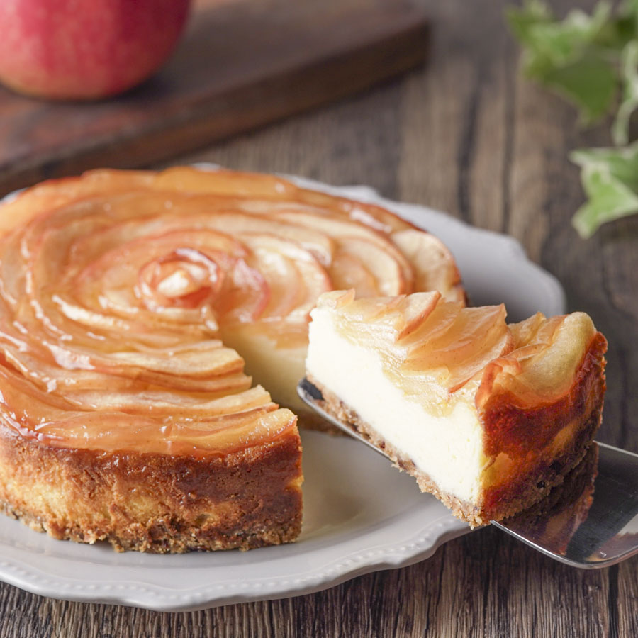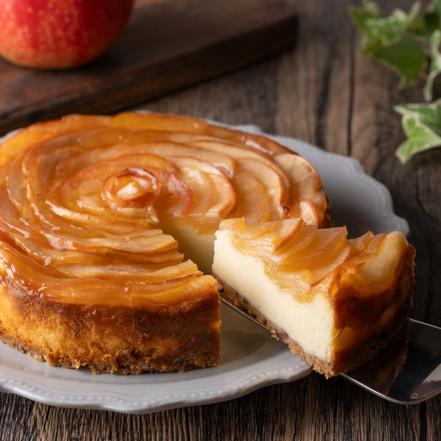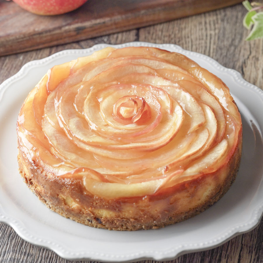 ケーキにりんごのお花が咲いたような見た目が華やかなベイクドチーズケーキ。