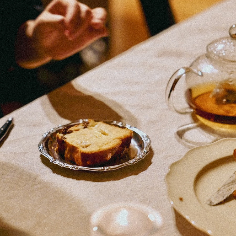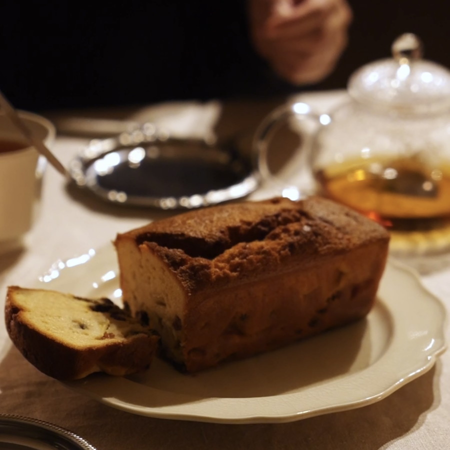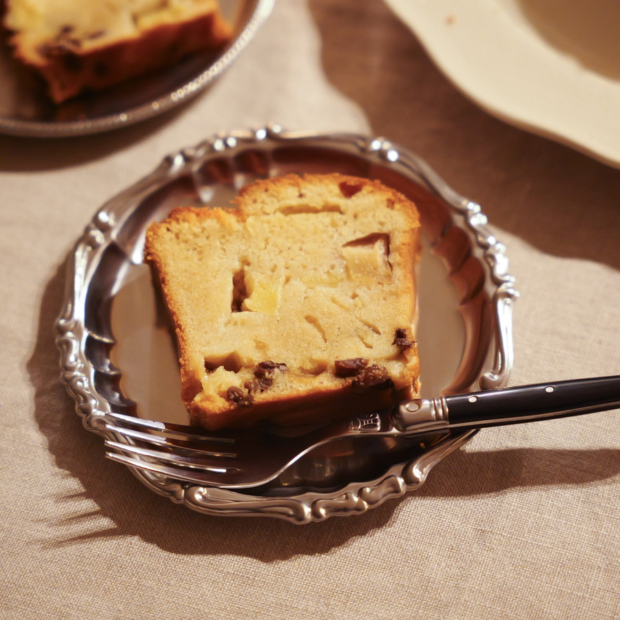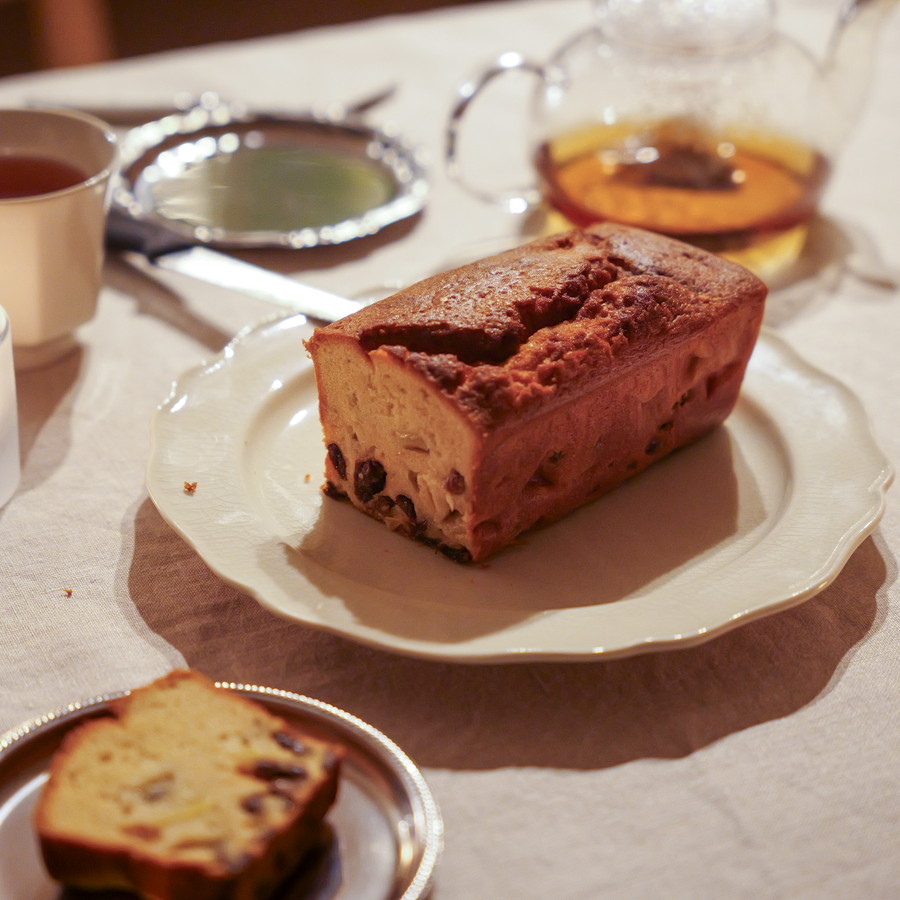 しっとり軽やかな生クリームパウンドに、甘酸っぱいりんごとラムレーズンをたっぷり混ぜ込みました。