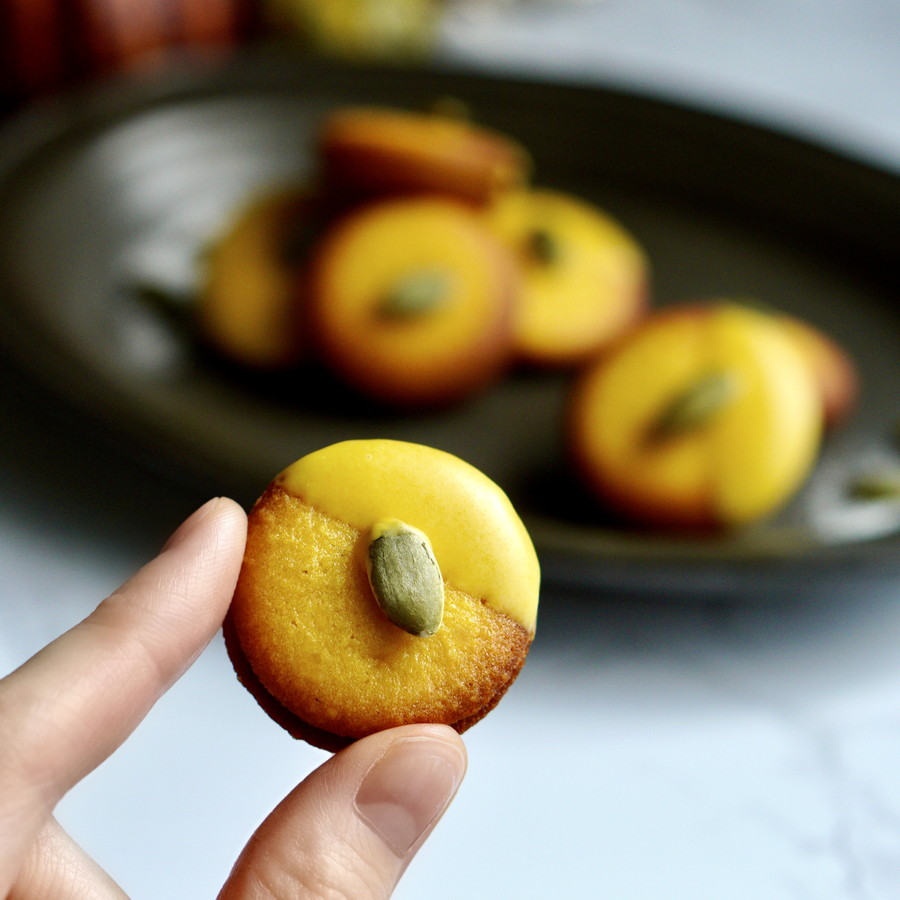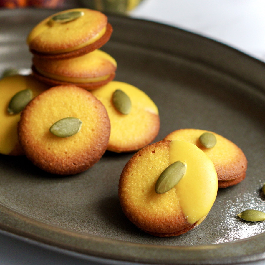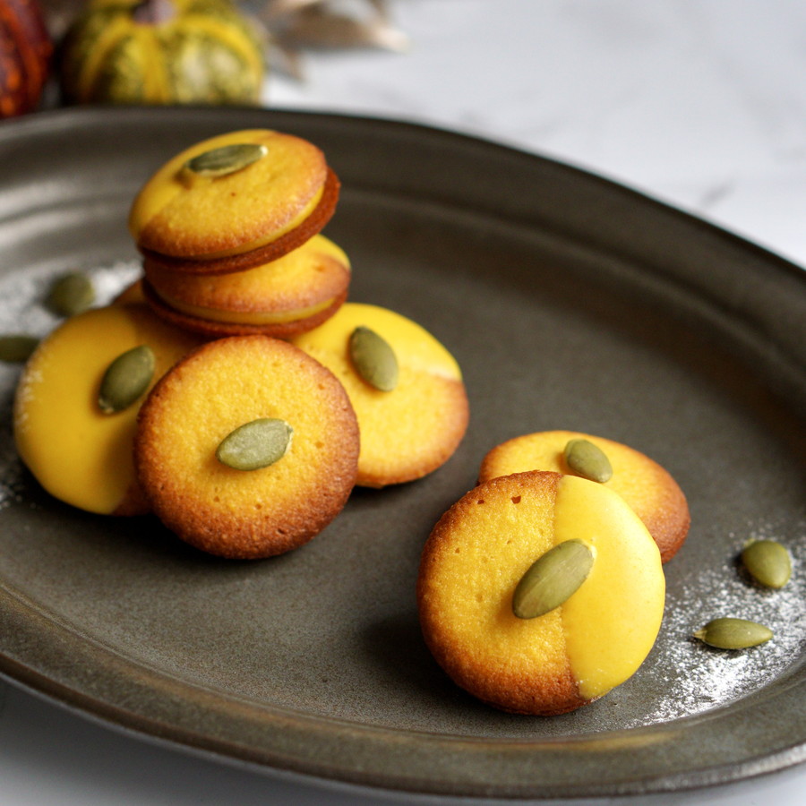 北海道産パンプキンパウダーを加えたカボチャ色のラングドシャに、スパイス香るカボチャのガナッシュをサンドしました。