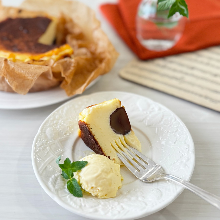 カットしたバスクチーズケーキにバニラアイスを添えて完成です。