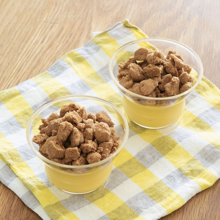 クリーミーなかぼちゃのレアチーズにシナモン風味のサクサク米粉クランブルをたっぷり!レアチーズ部分はかぼちゃが主役になるようにし、ヨーグルトやレモンは使わずにやさしい口当たりに仕上げています。
