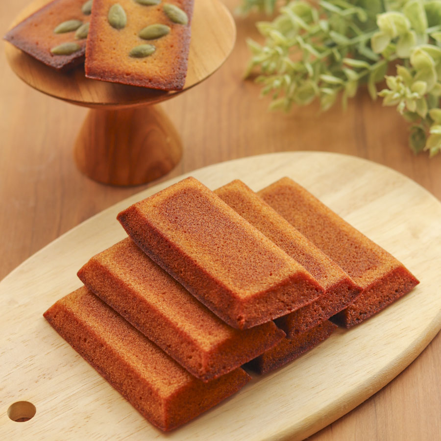 準備した型に生地を入れ、かぼちゃの種をのせる。180度に予熱したオーブンで約15分焼く。