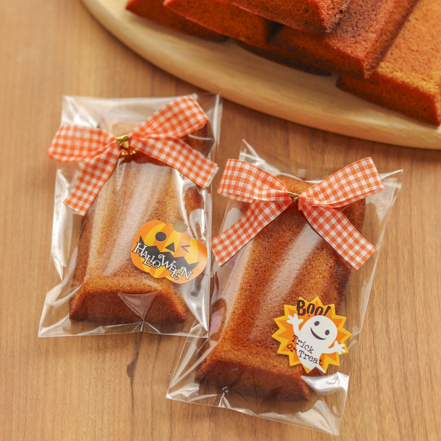 フィナンシェを入れた袋の斜め上にリボンを貼り付け、その斜め下にハロウィンシールを貼れば完成。