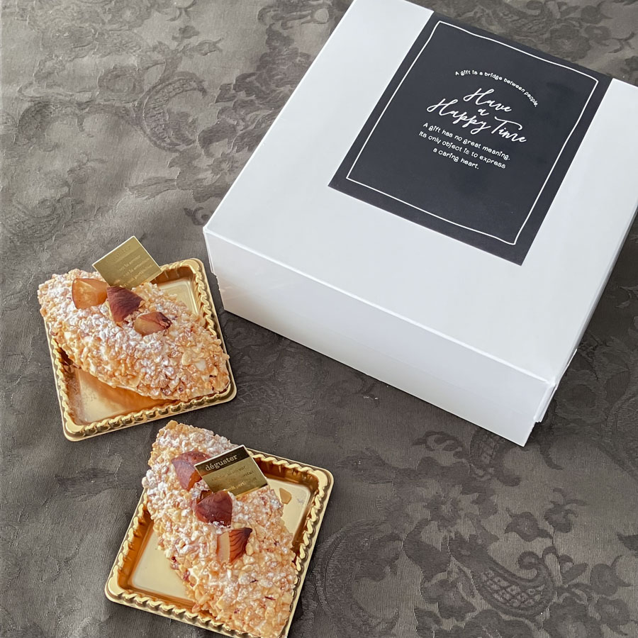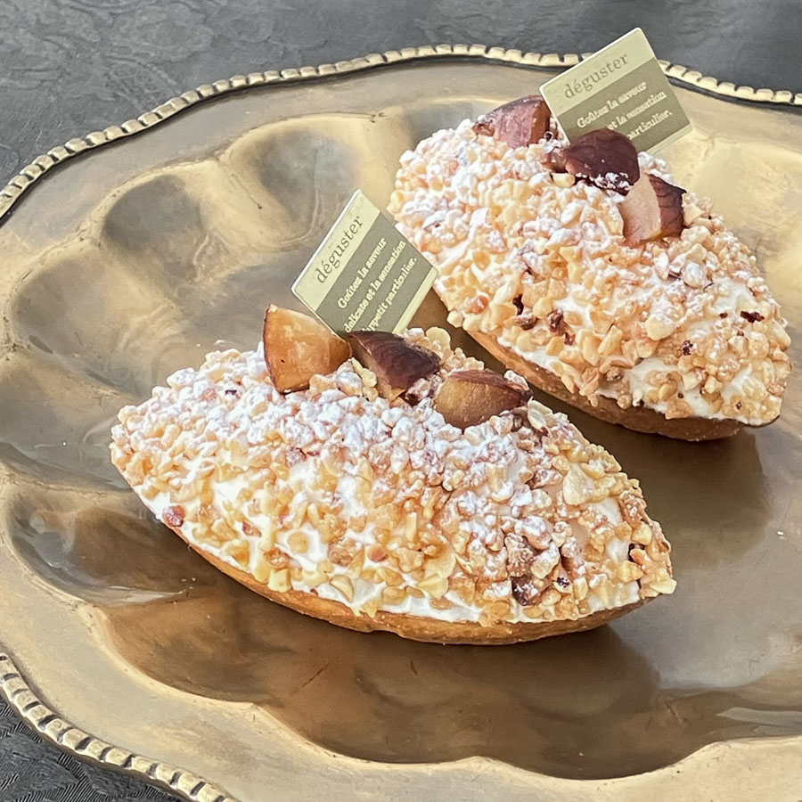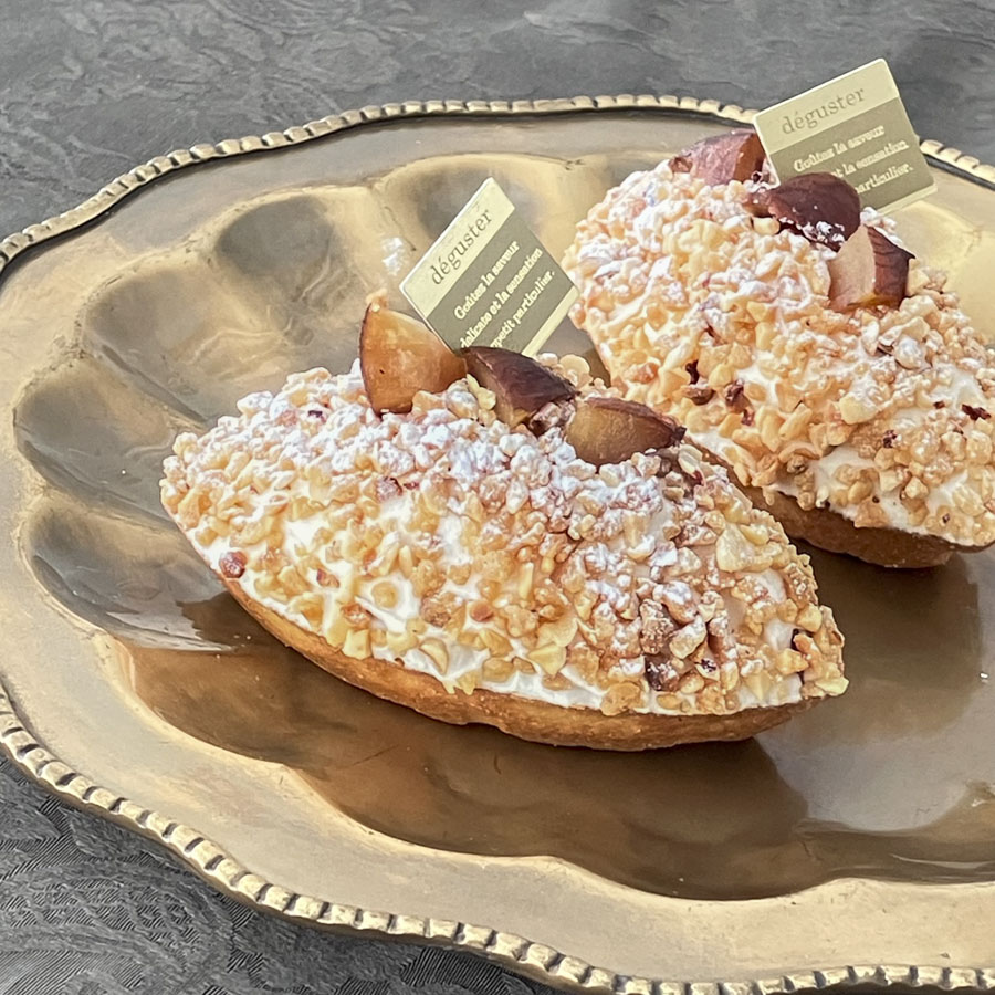 周りにまぶしつけたヘーゼルナッツクロカントの香ばしさとカリカリとした食感が、メープルクリームのおいしさを引き立てます。相性の良いマロン、メープル、ナッツのハーモニーが楽しめるプティガトーです。