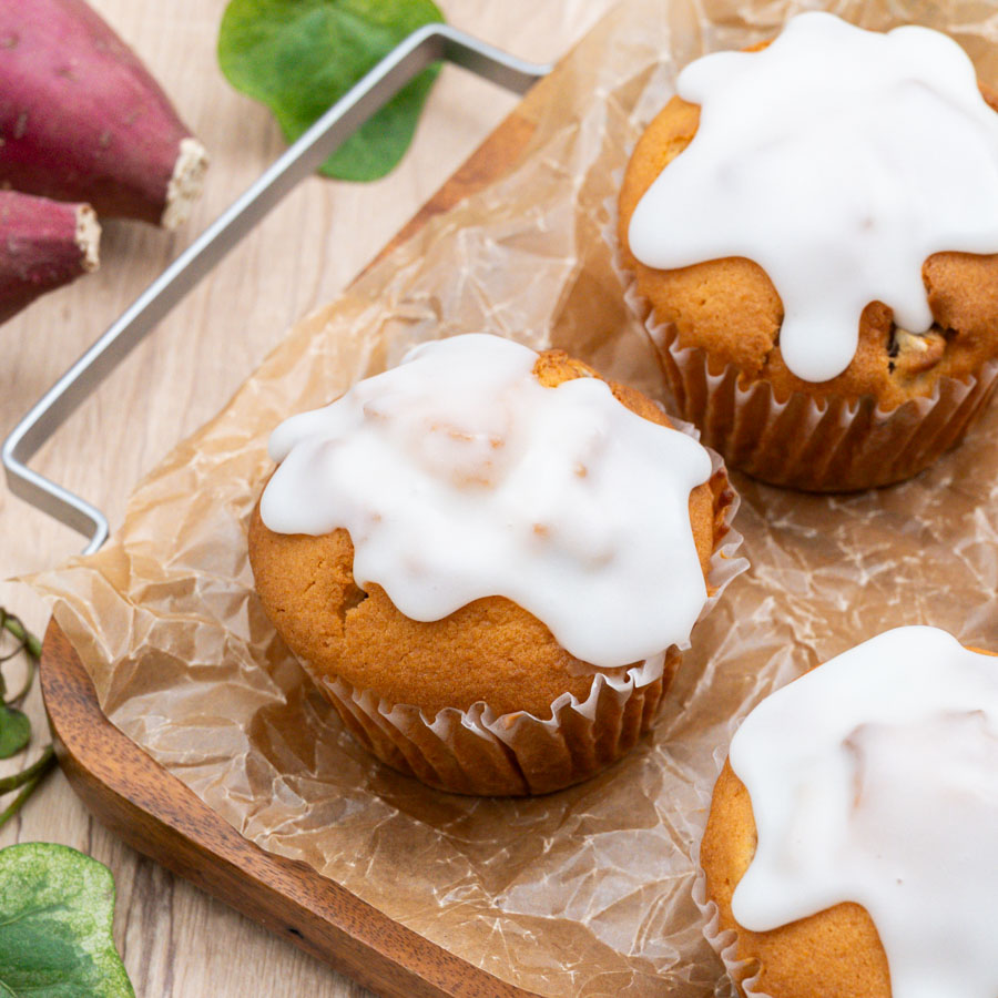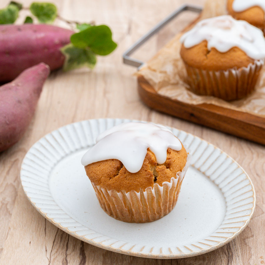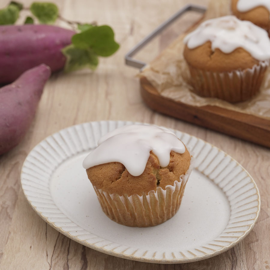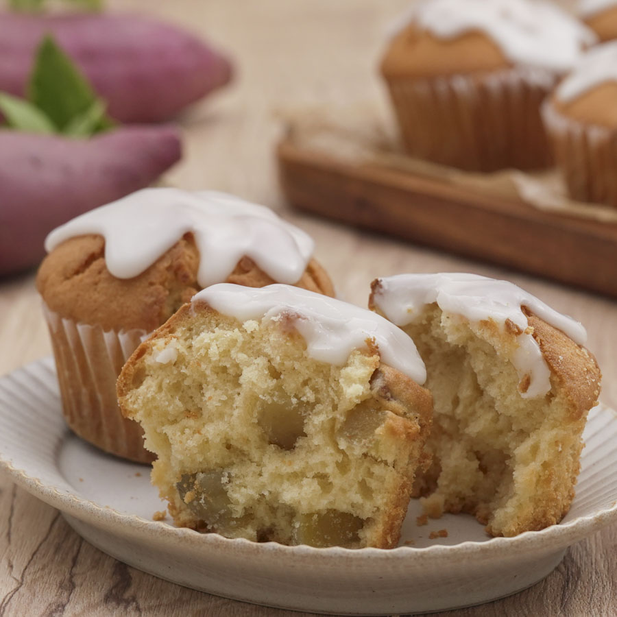 さつまいもの甘納豆を使ったさつまいものマフィン。ごろっとしたさつまいもとメープルシュガーの優しい甘みがよく合います♪