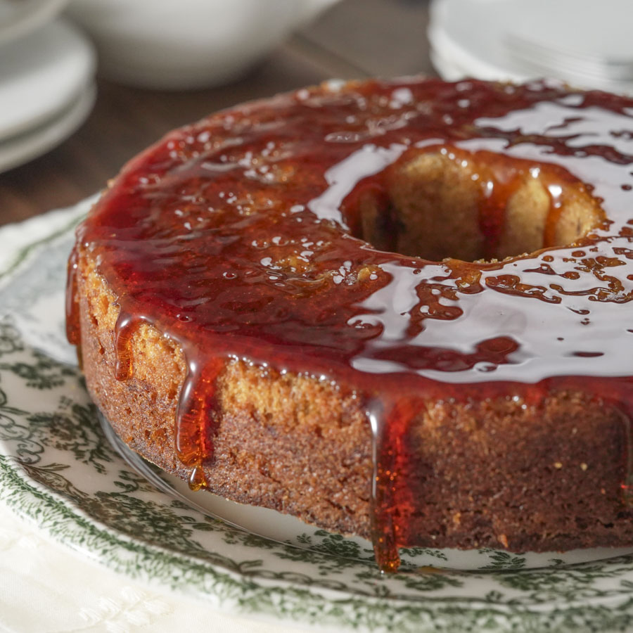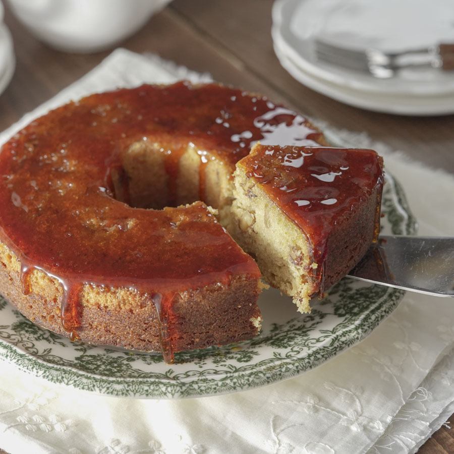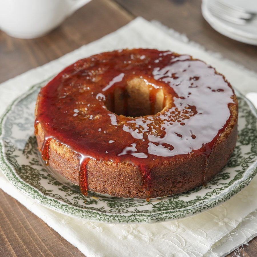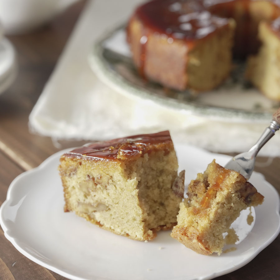 しっとり、ふんわりしたメープル生地の上面にメープル風味のキャラメルをたっぷりかけたケーキ。