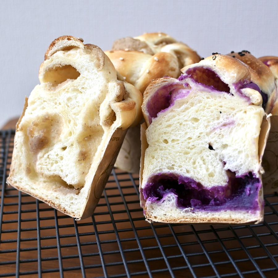 もう一つの生地も紫芋あんを用いて、6〜14の工程を繰り返して成型する。