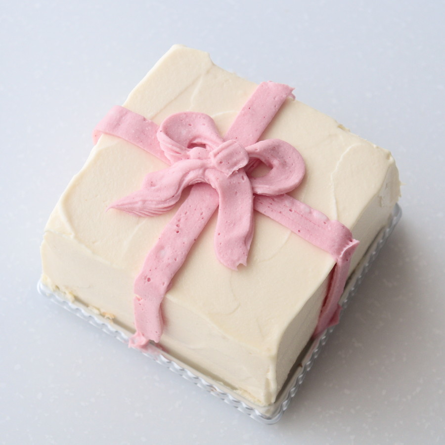 出来合いのスポンジシートと、混ぜるだけのバタークリーム風ミックス粉を使えば、オーブンなしで驚くほど簡単に完成します。リボンの色は、お好みの着色料で色付けすれば、アレンジも自由自在です。