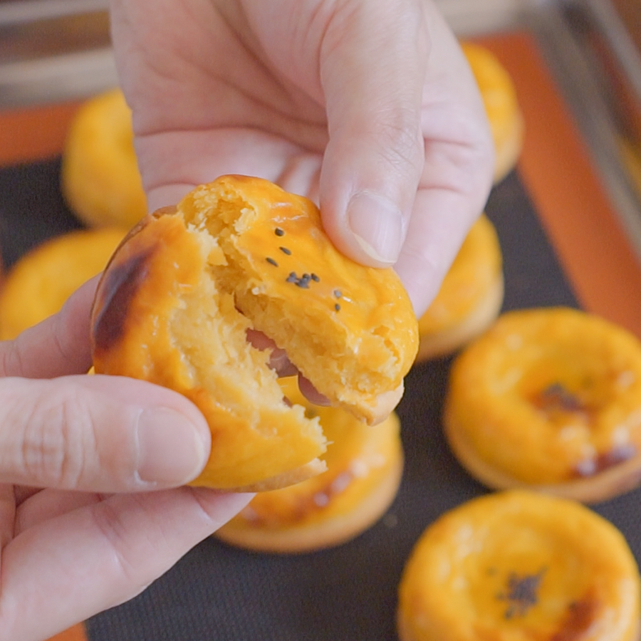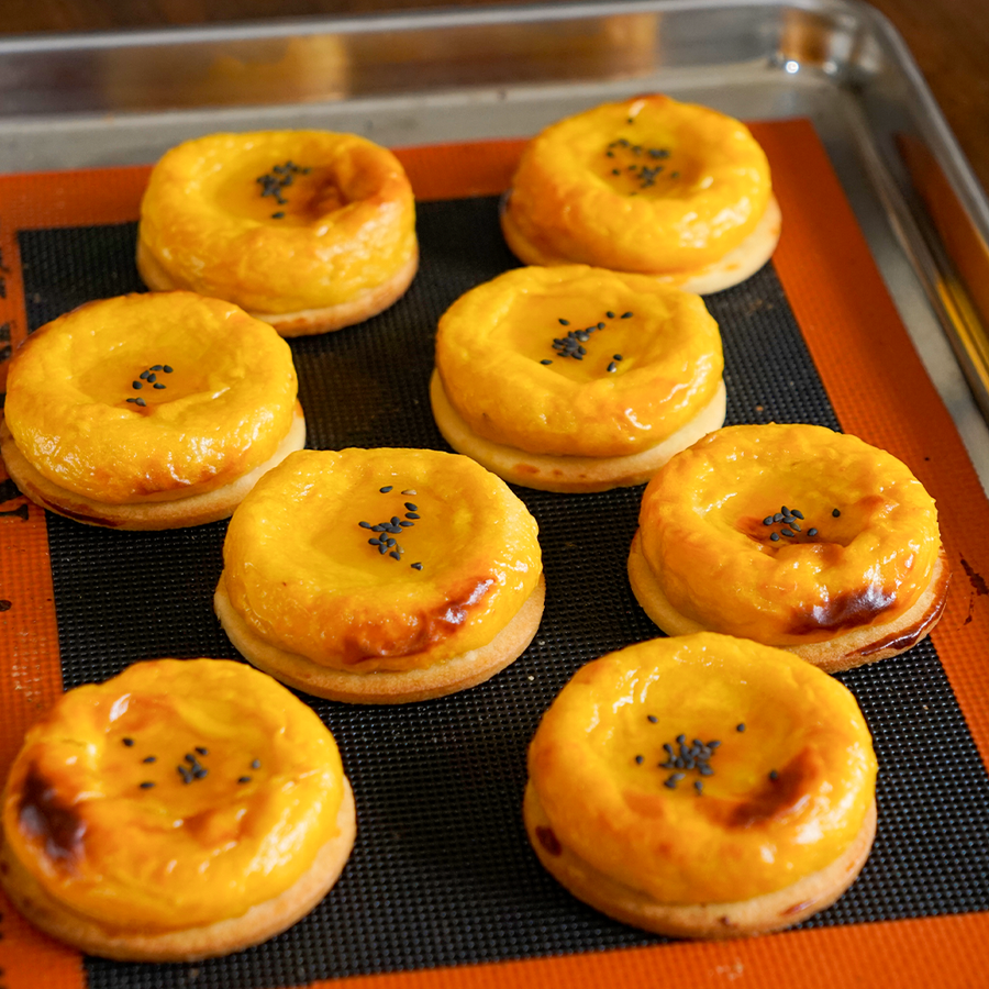 サクサクのタルト生地の上に、なめらかなサツマイモ生地をのせたお菓子です。