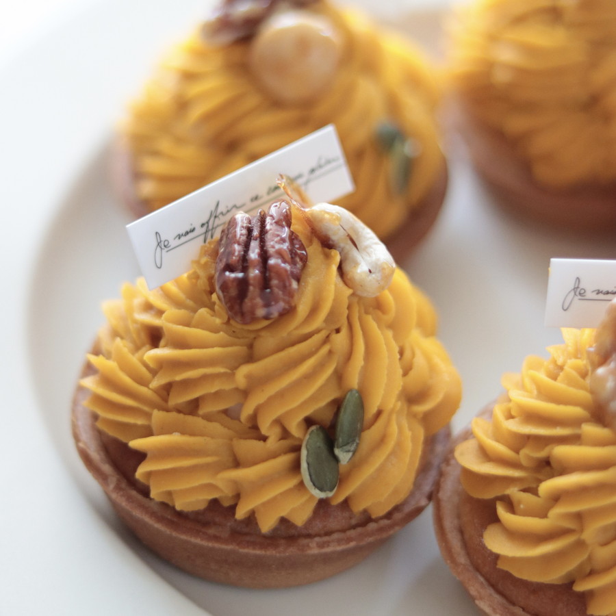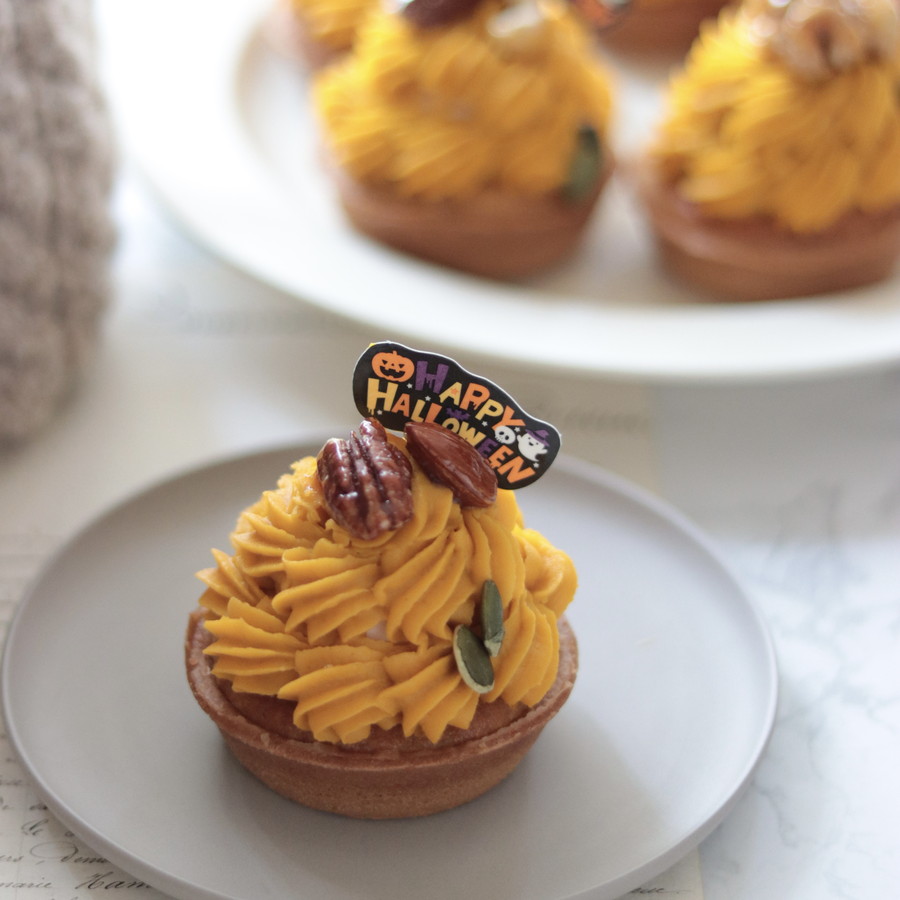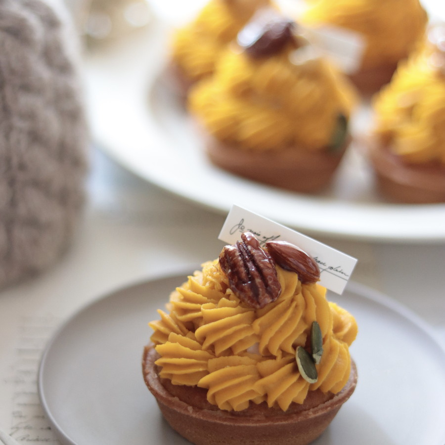 3のダマンドを絞り袋に入れ、クッキータルトに絞り、170度に予熱したオーブンで15分程焼く。