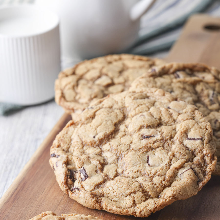 このレシピのチャンクチョコクッキーは重曹を加えて生地を柔らかく仕上げ、薄く広がりやすい生地にすることでチューイーな食感に仕上げています。また、砂糖をたっぷりと使うことで、濃厚な食感と焼きあがった生地のしっとり感を保ちやすくしてくれます。生地の水分を飛ばしすぎないように焼き過ぎないこともポイントです!
