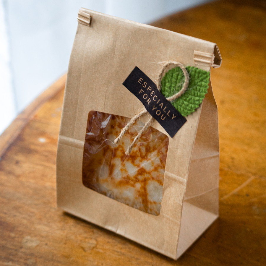 袋にナンを2枚縦に入れ、袋の口を閉じる。リーフシールを貼って完成。