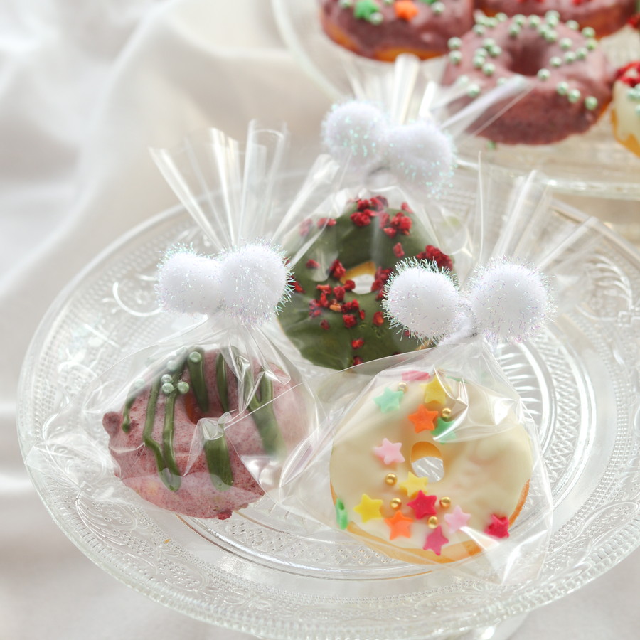 袋の口を蛇腹におり、ラメポンポンが表面に来るようにしながら、付属のモールをぐるぐると巻き、留めて完成。