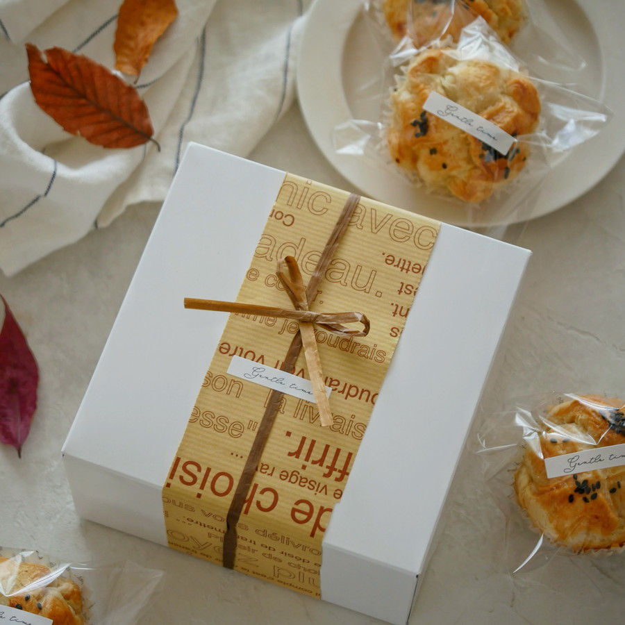 組み立てた箱の中底面にワックスペーパーを敷き、芋あんパイを4コ入れる。