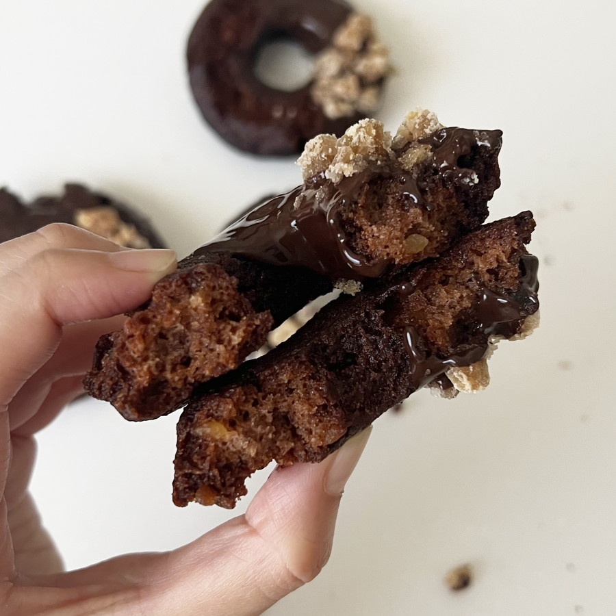 ドーナツの粗熱が取れたら、湯煎して溶かしたチョコレートでコーティングする。