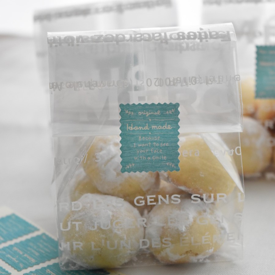 スノーボールクッキーを6粒ずつ袋に入れて封を折り、シールを貼り完成。