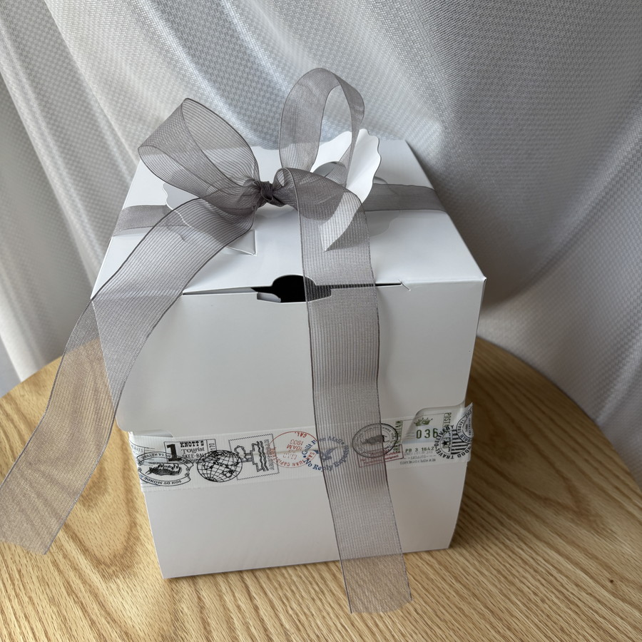 シンプルな手順を組み合わせるだけなのでコツと練習あるのみです!箱は6号(ワンサイズ大きめ)二つを養生テープで組み立てて高さのあるケーキに対応させています。