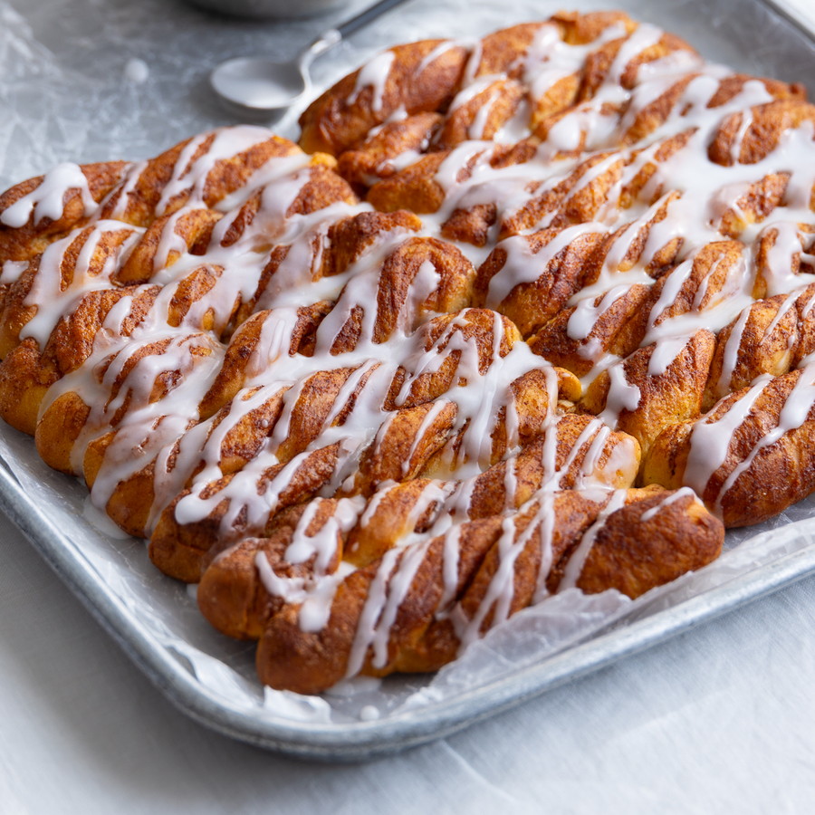 シナモンシュガーをまぶした生地をひとつずつツイストして並べ、たっぷりのシナモンシュガーペーストを重ねて焼き上げます。