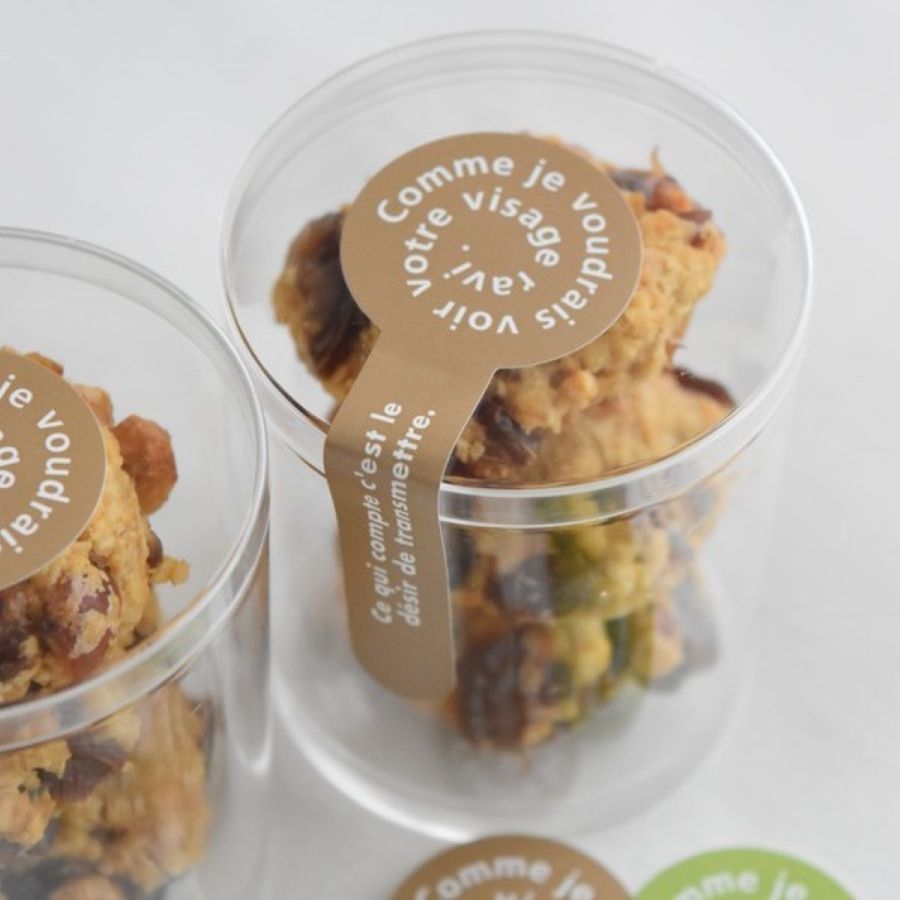 プラスチックの容器にクッキーを3枚入れ、蓋をし、シールで留めて完成。