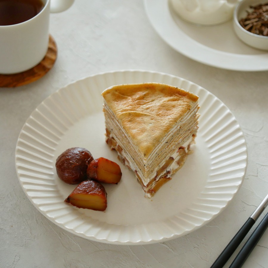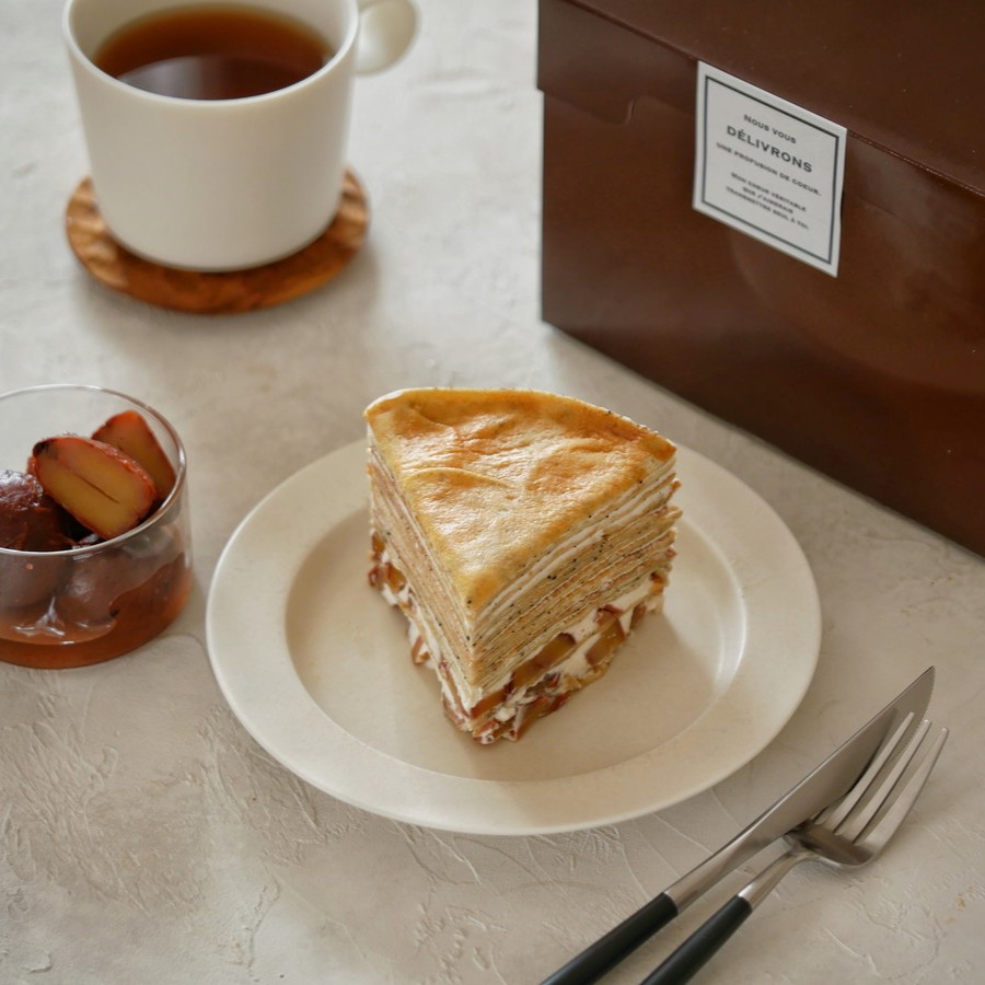 香ばしいほうじ茶のクレープ生地にほうじ茶クリーム、栗の渋皮煮を合わせた和のミルクレープです。