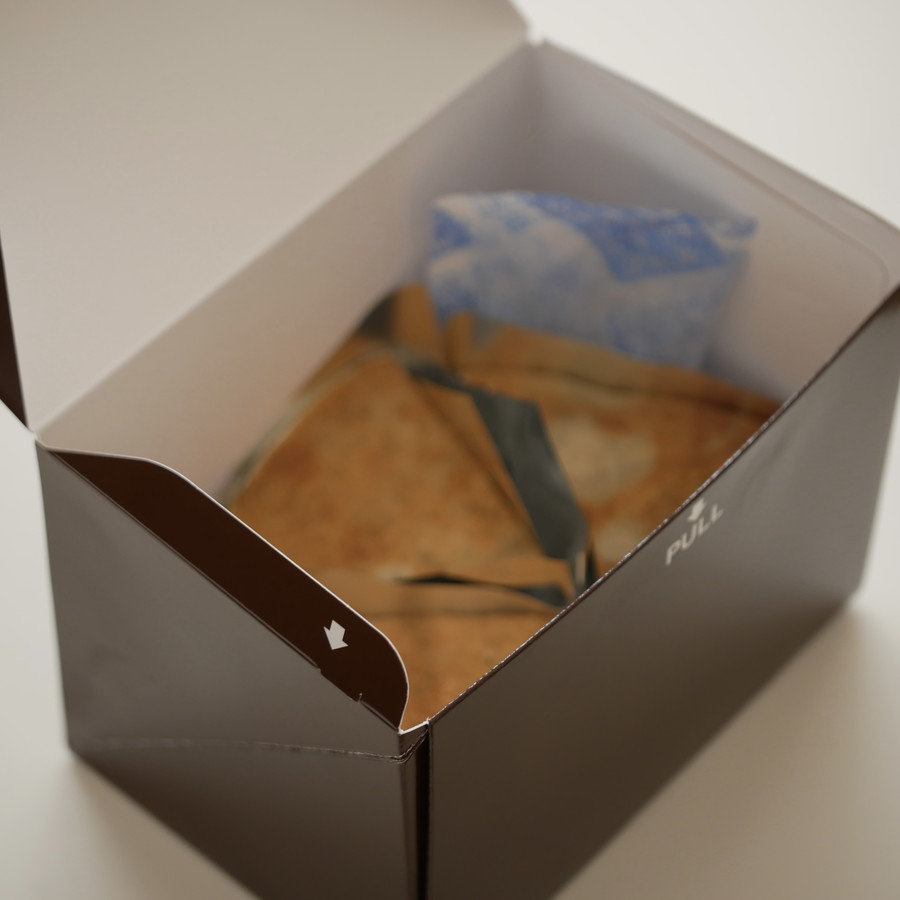 組み立てた箱に保冷剤と一緒にケーキを2~3コ入れる。