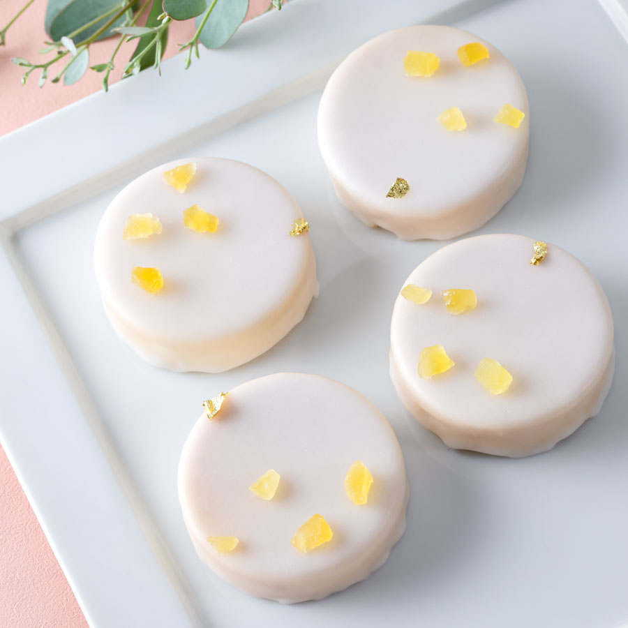 タルトを裏返し、底面側にグラスアローをかける事で、表面がつるっと平らにきれいな仕上がりになります。
