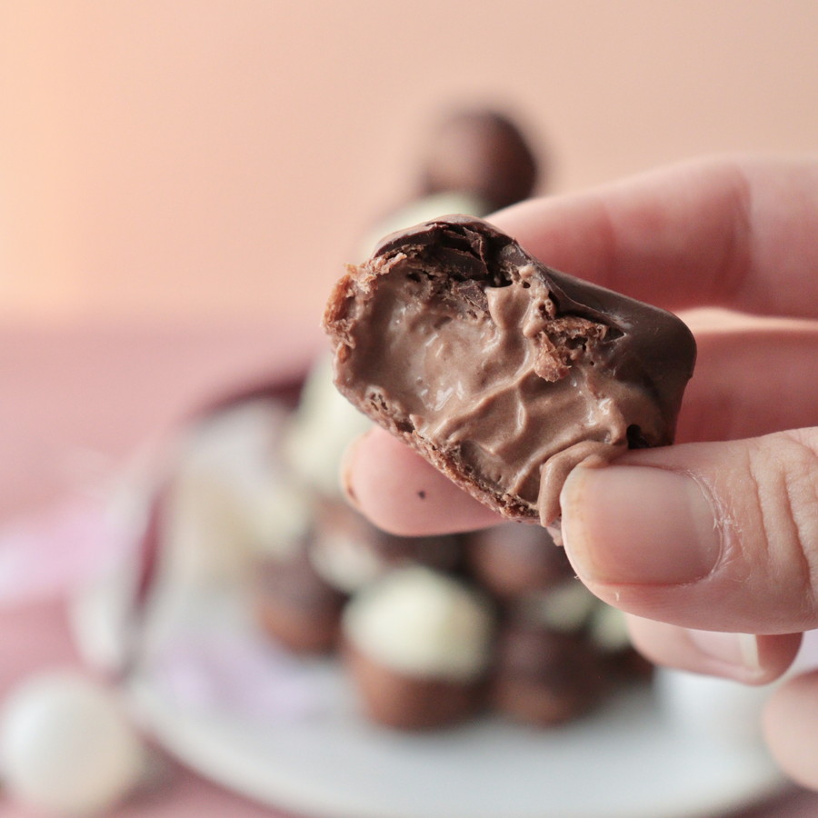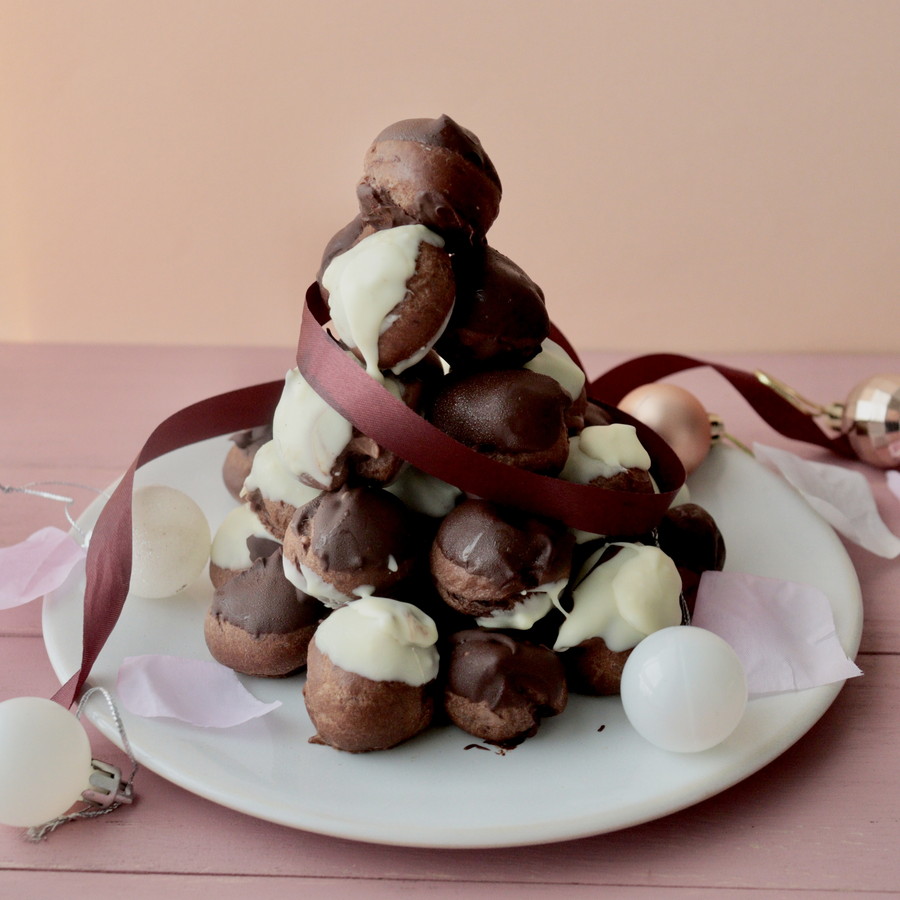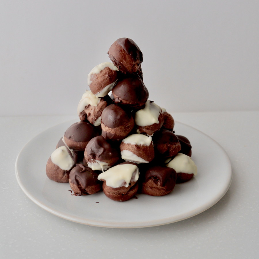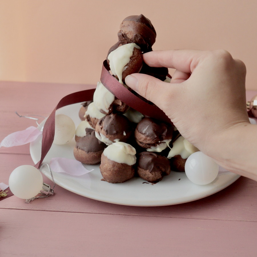 チョコ味のプチシューをホワイト&ダークチョコでコーティングして重ねるだけで、まるでお菓子のツリーみたい。