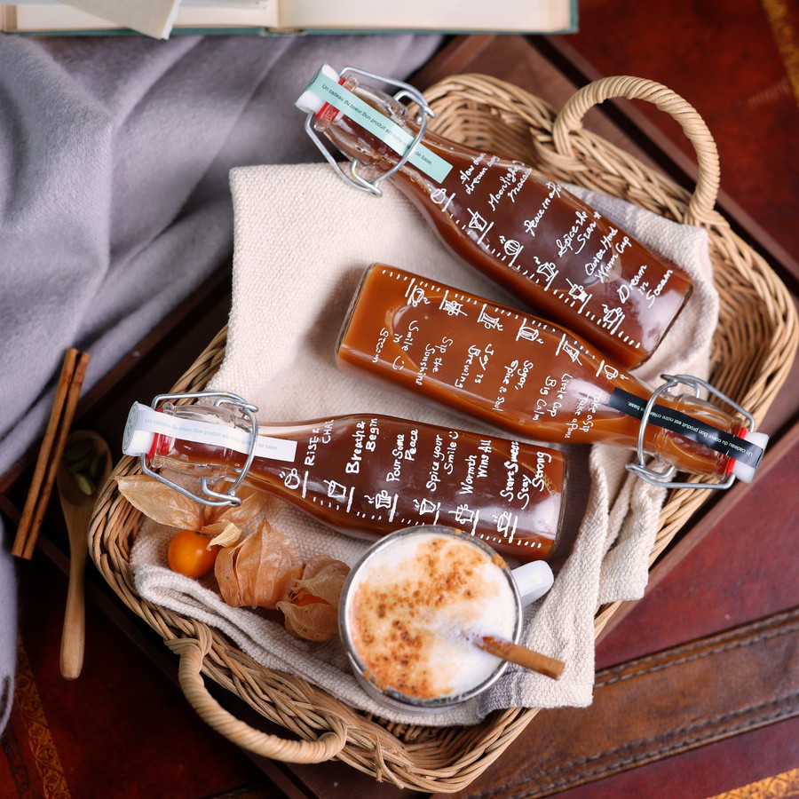 14のチャイベースを濾しながら、熱いうちに煮沸消毒した瓶に詰める。