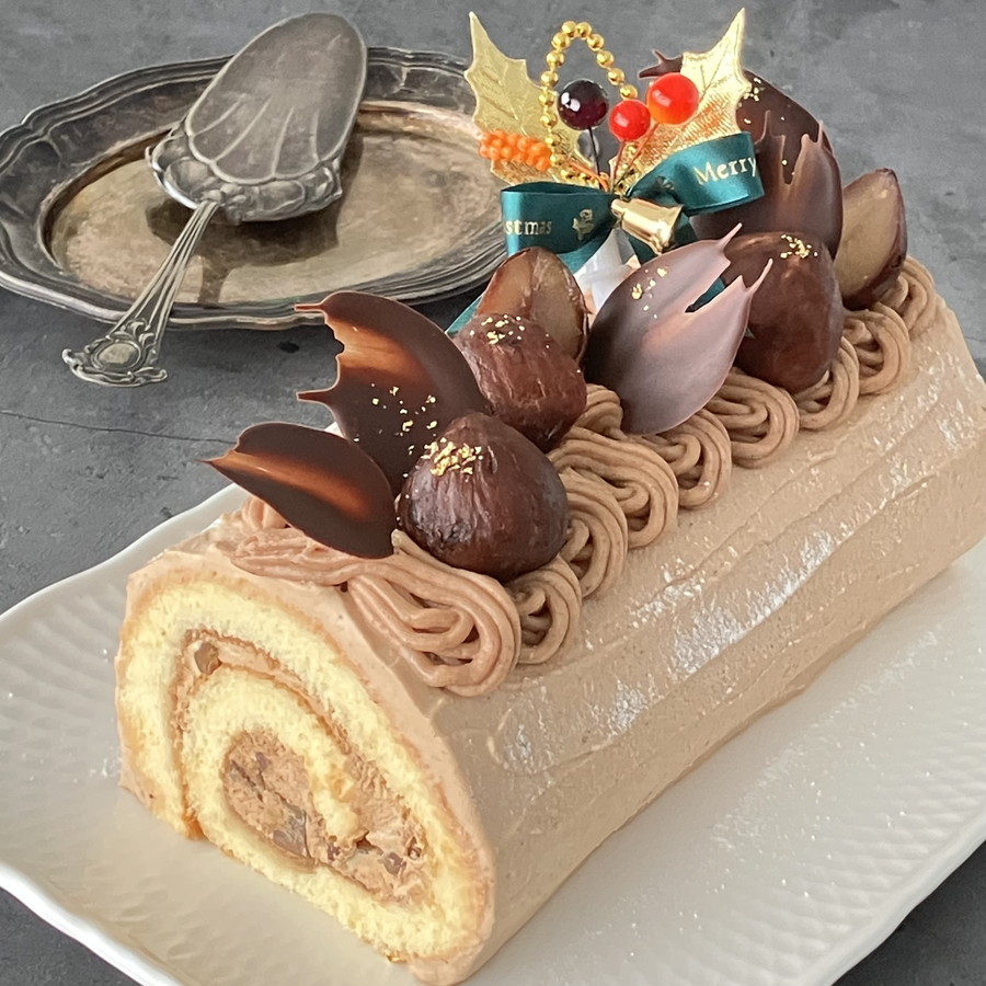 ちょっぴりほろ苦いカフェクリームを巻き込んだロールにマロンクリームを塗って「薪(ブッシュ)」を表現し、濃厚なクリームをモンブラン口金で絞って仕上げます。