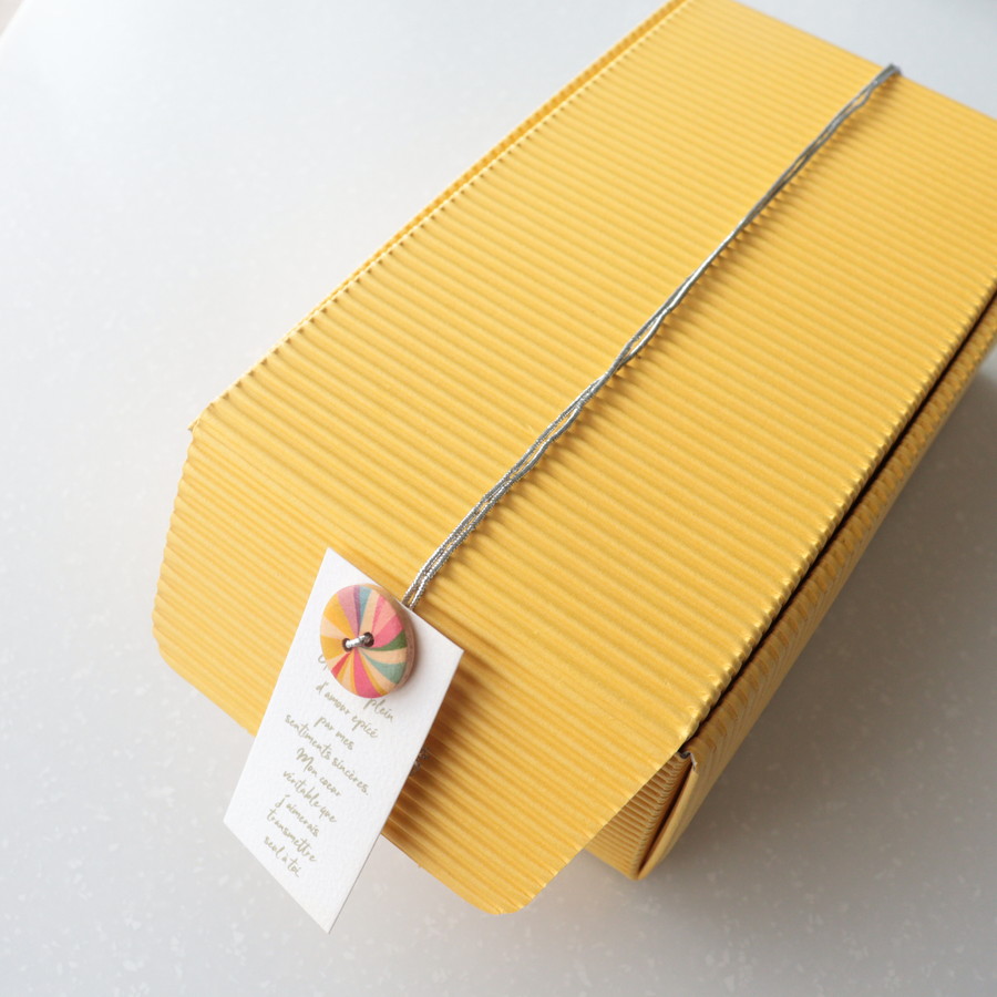 蓋をして付属の飾り付きゴムでラッピングして完成。
