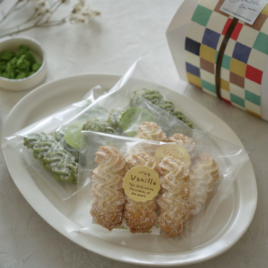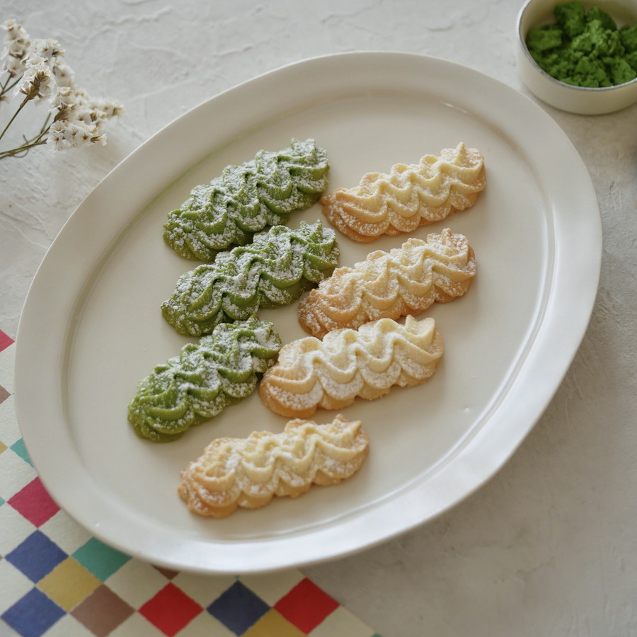 サクッと軽い食感がやみつきになる、絞り出しクッキーです。甘い香りのバニラとほんのりほろ苦い抹茶の2つが楽しめるレシピにしました。