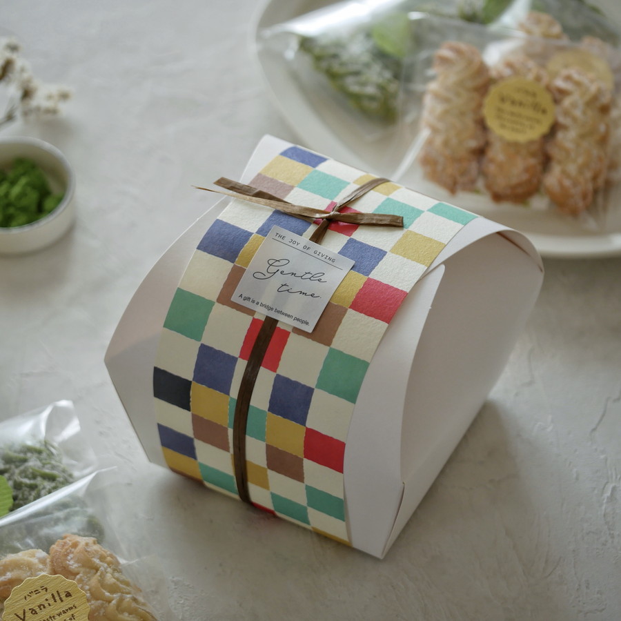 箱に紙パッキンを敷いて、②のクッキーを4袋入れる。