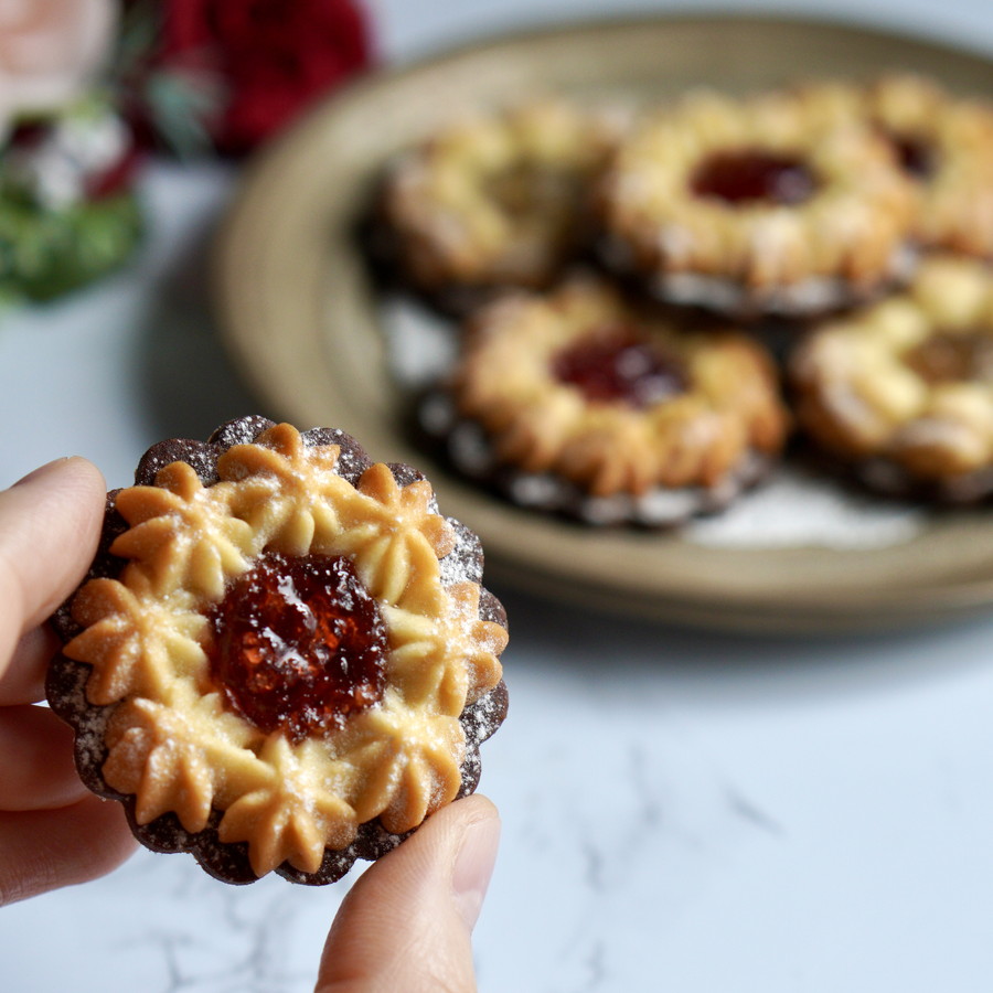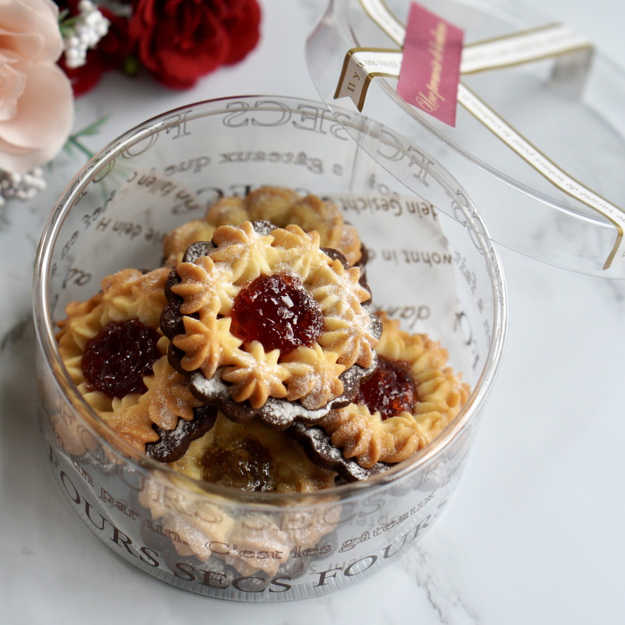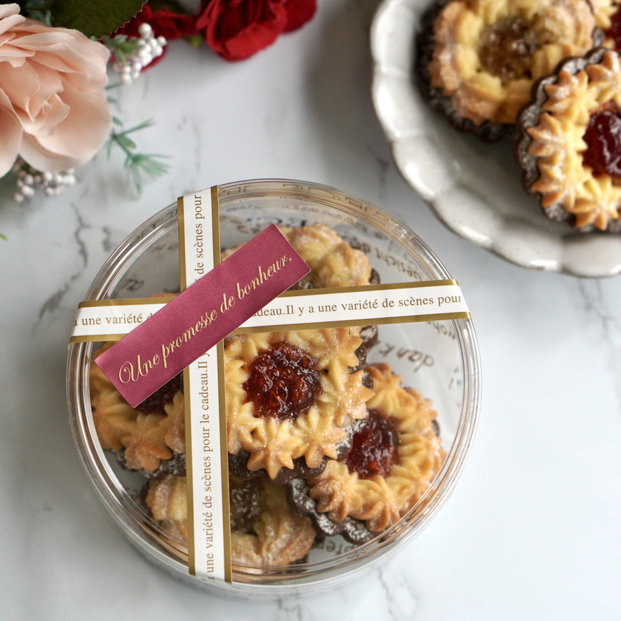 型抜きクッキーと絞り出しクッキーの2種類のクッキーの食感とジャムの果肉感をお楽しみください。