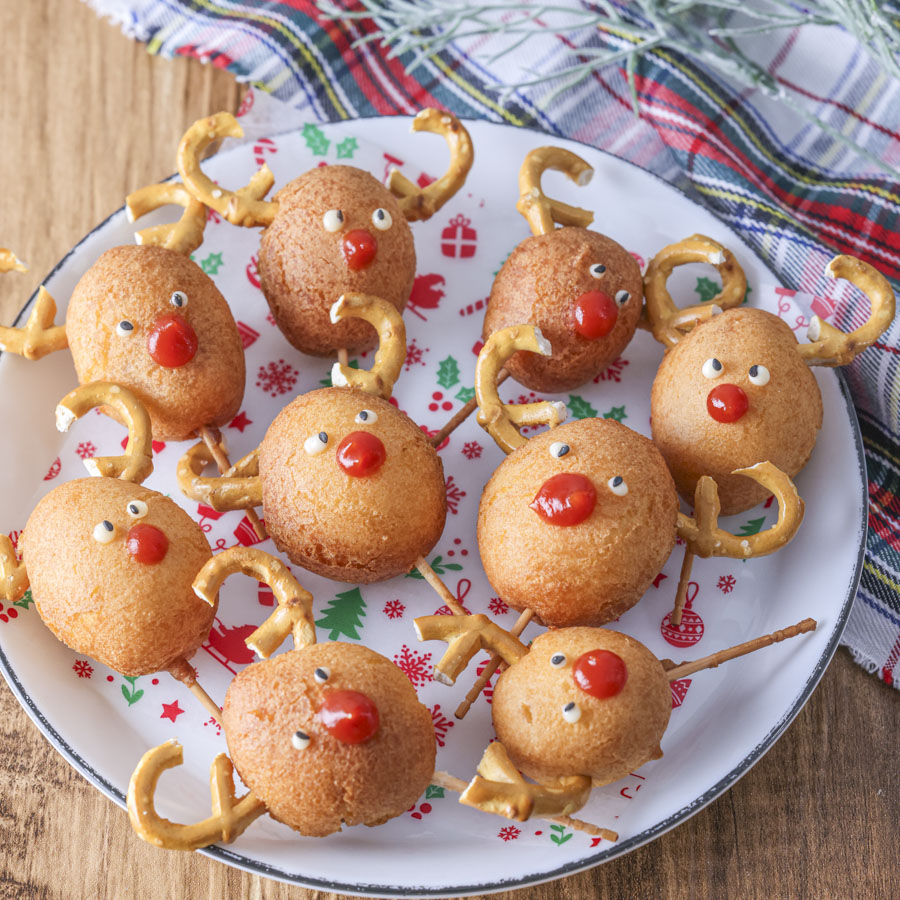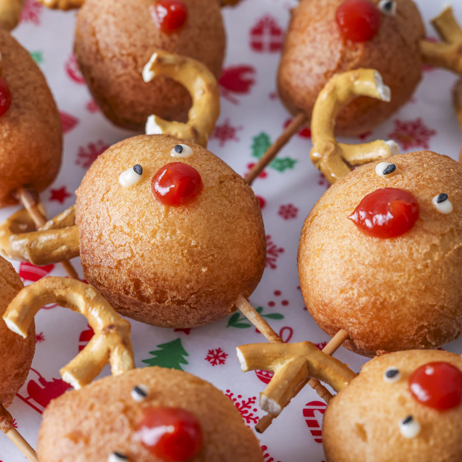 パンケーキミックスで作るクリスマス仕様の簡単アメリカンドック。一口サイズなのでパーティーにもぴったりのレシピです。