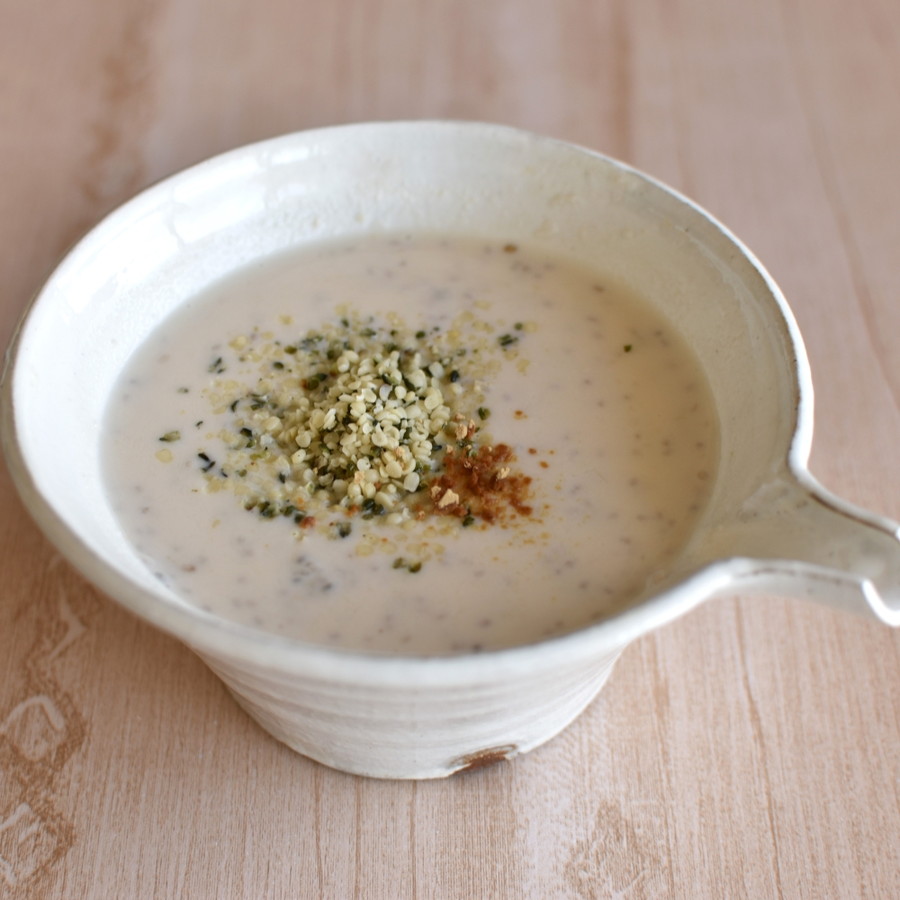 忙しい朝食の代わりや遅くなってしまった日の夜ご飯の代わりに。夏は冷たく、冬は温めて。植物性タンパク質、食物繊維、良質な脂質、ミネラルがバランスよく取れる組み合わせなので、腸内環境をサポートし、美肌づくりに役立つドリンクです。