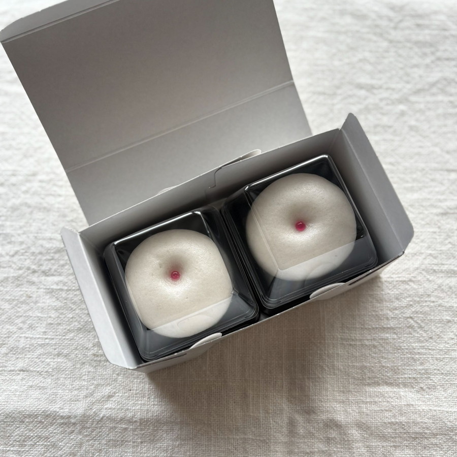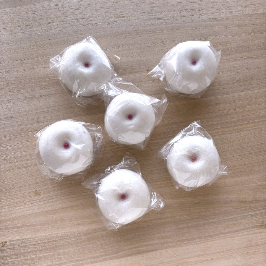 笑うとできるえくぼ、紅白の色合いもあり、おめでたいお菓子です。