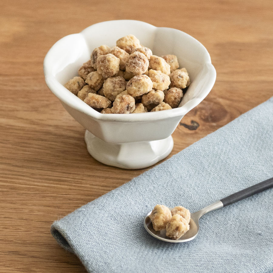 フライパンで軽くから煎りしてから糖衣がけにすることで、カリッとおいしいお茶請けになります。シナモンパウダーはお好みで調整してください。