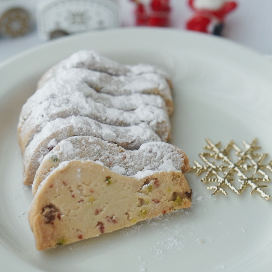 シュトーレンの形に手で成形して、4〜5㎝の厚さにナイフでカットする。クッキングシートを敷いた天板に切り口を上に並べて予熱後の170度で約17〜19分焼成。