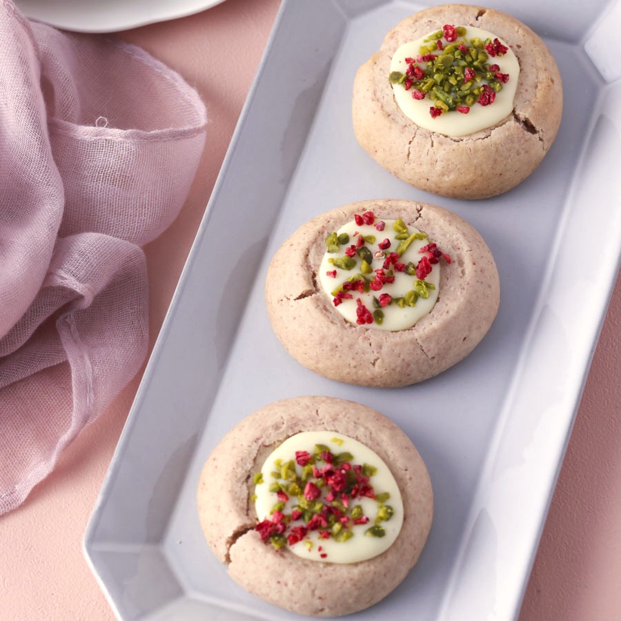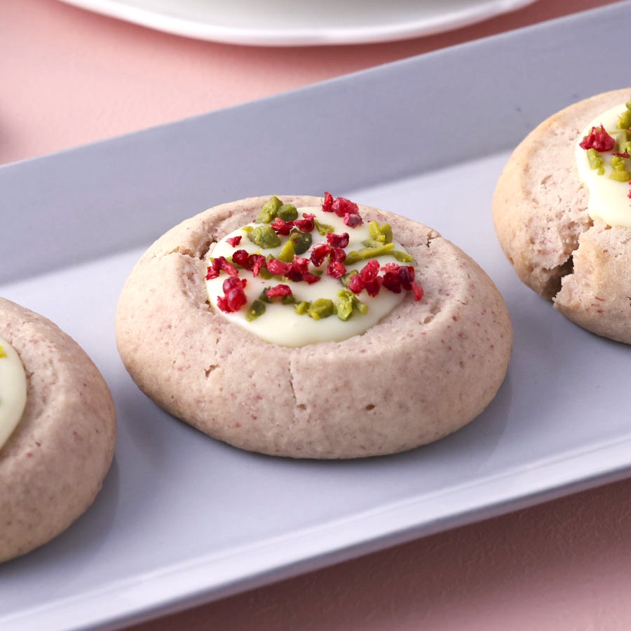 淡いピンク色の生地を丸めて中央をくぼませ、ホワイトチョコレートのガナッシュをたっぷり詰めたラズベリー風味のガナッシュクッキー。